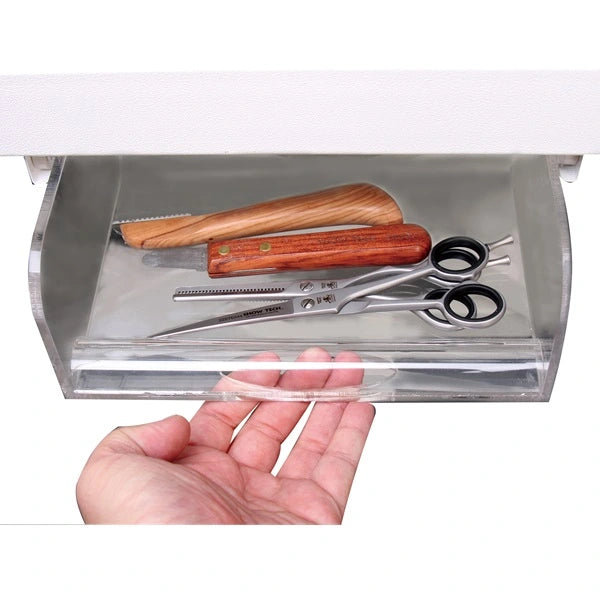 Stol za njegu opremljen je s dvije utičnice za napajanje i dvije USB utičnice. Lako su dostupne na prednjem rubu ispod ploče stola. Ovdje možete uključiti, na primjer, mašinicu za šišanje i istovremeno skloniti kabel. Prednji rub također ima šest kuka i malu kutiju za pohranu sitnica koje je dobro imati pri ruci